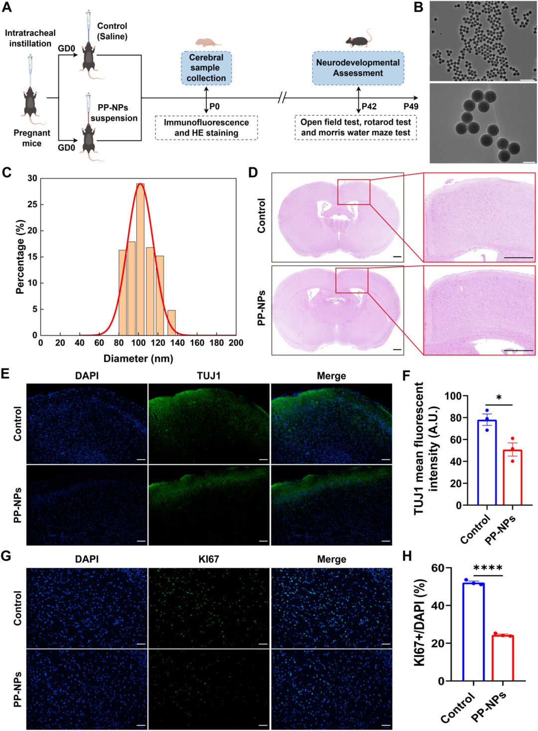 Fig.1 Effects of prenatal exposure to PP-NPs on fetal cerebral cortical development (A) Schematic overview of the mouse experiment. (B-C) Transmission electron microscopy images and Particle size analysis of PP-NPs. (D) Representative HE staining of cerebral cortex sections. (E-F) Expression of TUJ1 in the cerebral cortex sections. (G-H) Expression of KI67 in the cerebral cortex sections. [1].