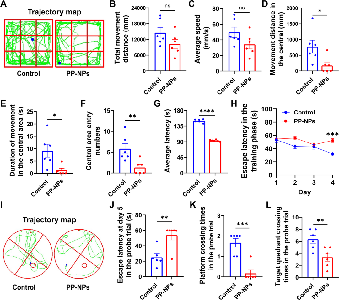 Fig.2 Effects of prenatal exposure to PP-NPs on neurobehavior in mouse offspring. (A-F) Open field test. (G) The average latency to fall in rotarod test. (H-L) Morris water maze test[1].