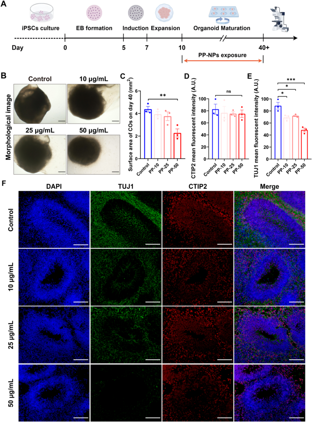 Fig.3 PP-NPs inhibited growth and neuronal differentiation of human COs. (A) Schematic diagram of PP-NPs exposure on COs. (B) Morphological changes of COs in four groups on day 40. (C) Surface area of COs on day 40. (D-F) Expression of TUJ1 and CTIP2 in COs from four groups on day 40[1].