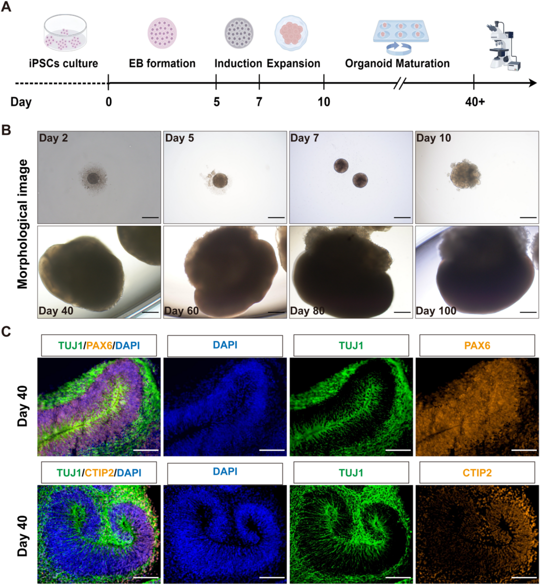 Fig.5 Characterization of the human COs. (A) Protocol diagram of COs culture. (B) Morphological changes of COs at different time points (2, 5, 7, 10, 40, 60, 80 and 100 days). (C) Immunofluorescent staining of COs on day 40[4].