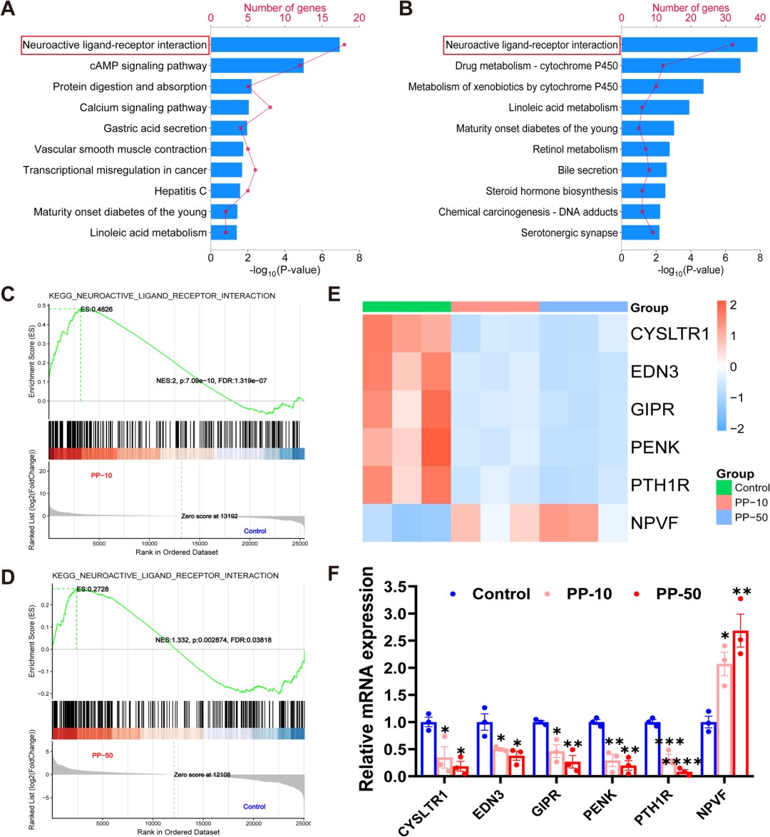 Fig.4 Pathway enrichment analysis and expression of common DEGs in the NLRI pathway. (A) KEGG pathway enrichment analysis based on DEGs between PP-10 group and control group. (B) KEGG pathway enrichment analysis based on DEGs between PP-50 group and control group. (C-D) GSEA analysis of neuroactive ligand-receptor interaction pathway. (E) Heatmap of the common DEGs in NLRI signaling pathway. (F) RT-qPCR analysis of CYSLTR1, PTH1R, GIPR, EDN3, PENK, and NPVF mRNA[1].