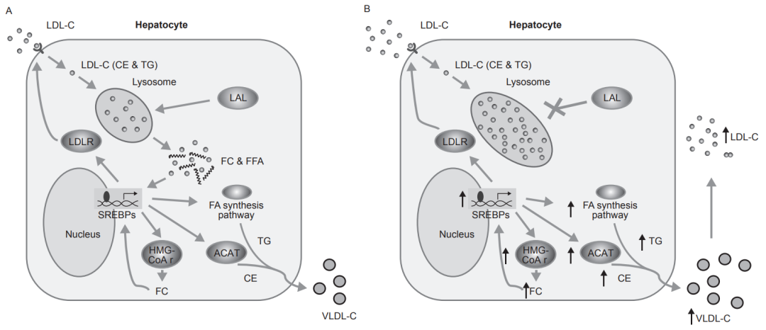 图1. 健康个体和LAL-D患者的细胞胆固醇稳态的示意图[1]。
