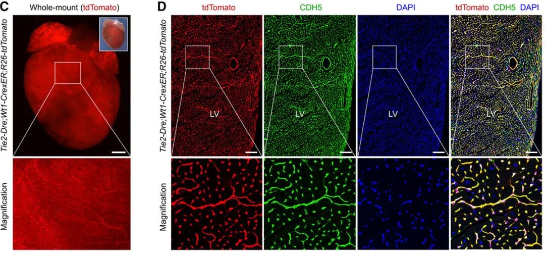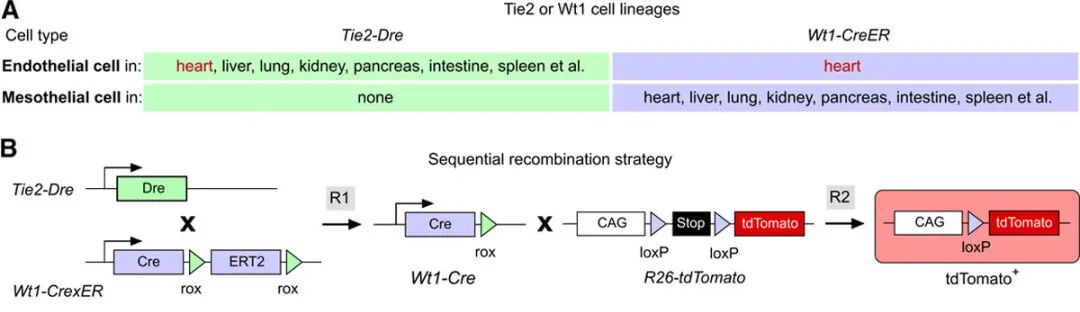 研究者关注的是冠状动脉内皮细胞,因而他们构建了以下的小鼠:Tie2-Dre;Wt1-CrexER;R26-LSL-tdTomato。