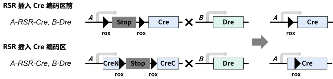 roxCre 是将 rox-Stop-rox(RSR)插入 Cre 编码区前或编码区中,在移除 Stop 序列之前,Cre 无法正确进行转录和翻译。将该小鼠与另一个 Marker 基因启动的 Dre 小鼠进行交配后,Dre 介导 RSR 之间发生重组将 Stop 序列去除后,该 Cre 才能正常发挥功能。