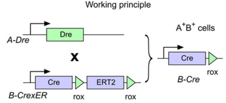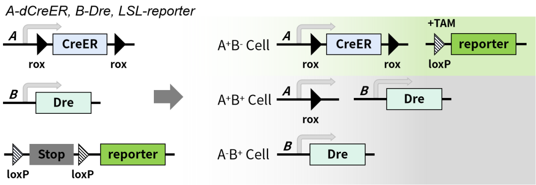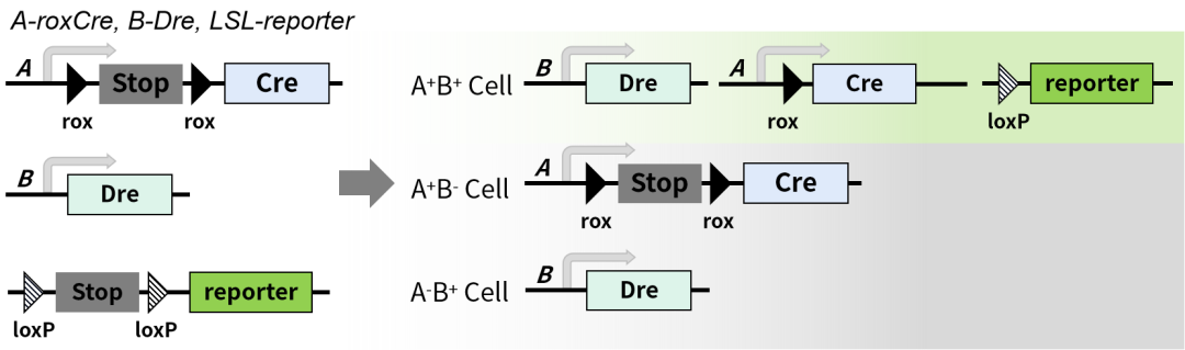 若我们想标记 A+B+ 细胞,我们就可以利用启动子 A 介导的 roxCre 小鼠、启动子 B 驱动的 Dre 小鼠、以及 LSL-Reporter 小鼠进行交配: