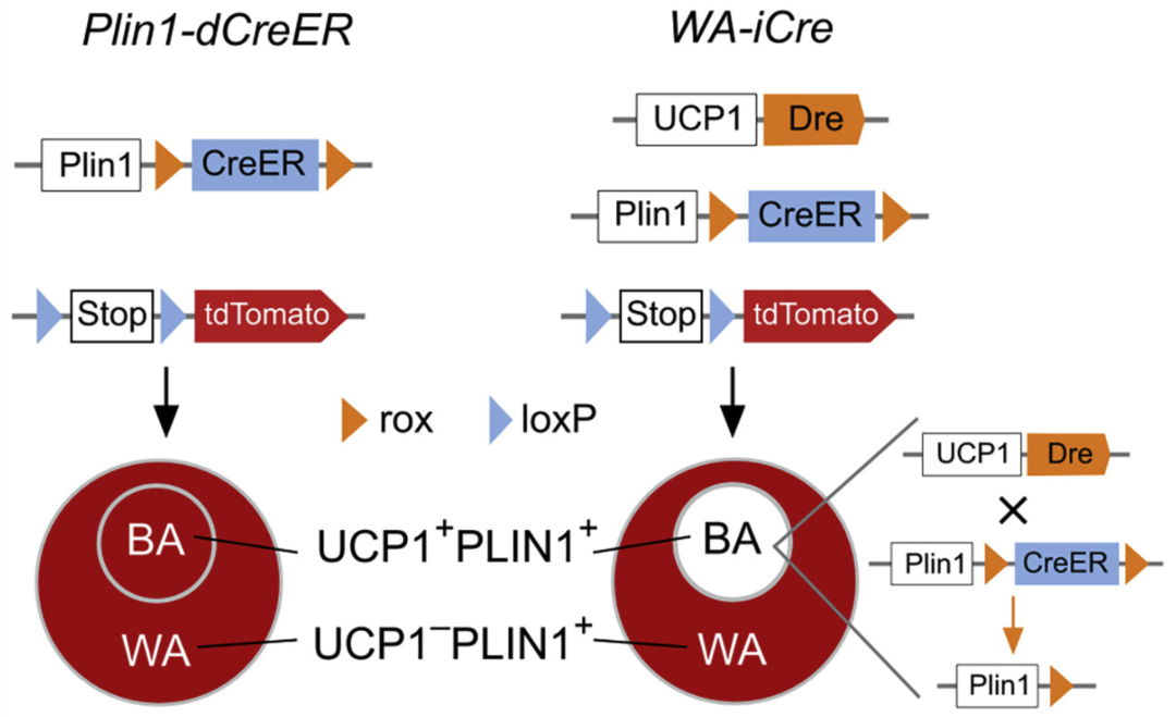 在 WAT 中,PLIN1 正常表达,UCP1 不表达,因而在 TAM 的作用下,细胞被标记为红色;在 BAT 中,UCP1 表达,进而 Dre 介导两个 Rox 位点发生重组,PLIN1 之后的 CreER 酶被去除,导致细胞无法被标记上颜色。