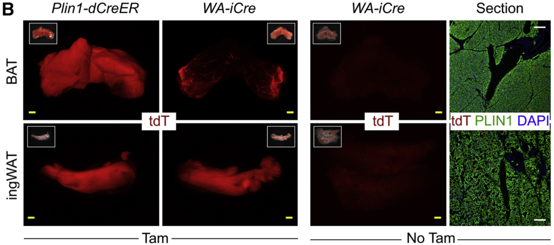 因而研究者利用 dCreER 遗传策略,构建了 Plin1-dCreER;Ucp1-Dre;R26-tdTomato 小鼠(下述将 Plin1-dCreER;Ucp1-Dre 交配小鼠称为 WA-iCre 小鼠)