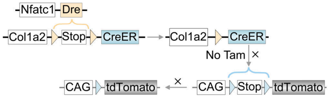 图. Nfatc1-Dre;Col1a2-RSR-CreER;R26-RL-GFP小鼠的基因重组图解[3]