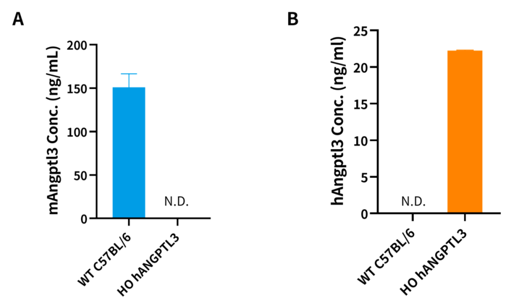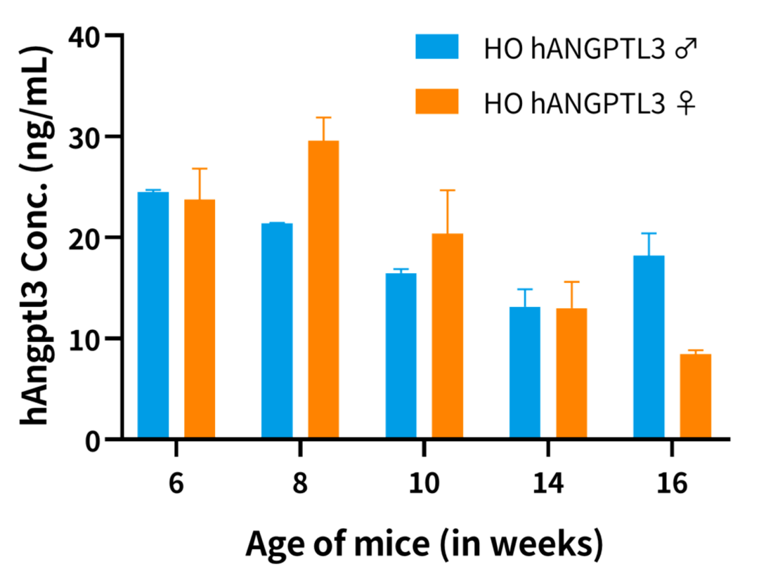 南模生物相关小鼠模型 南模生物长期致力于药物靶点人源化模型研究领域,南模生物研发的hANGPTL3靶点小鼠,表达完整人源蛋白以及包含人源3'UTR序列,是抗体和小核酸药物研发的高效工具模型。以下是小核酸药物ARO-ANG3案例。 hANGPTL3(NM-HU-210036) 部分药效验证数据: 图3. ELISA检测鼠源ANGPTL3以及人源hANGPTL3在hANGPTL3小鼠中的表达。hANGPTL3小鼠中有较高水平的人源ANGPTL3。 图4. ELISA检测鼠源ANGPTL3以及人源hANGPTL3在不同性别hANGPTL3小鼠中的表达。 图5. 检测给药前后hANGPT3小鼠的血脂水平。将hANGPT3小鼠随机分为两组(n=8),对小鼠施用ARO-ANG3(一种靶向ANGPTL3的核酸药物),结果显示,ARO-ANG3处理组TG,T-CHO,HDL-C水平显著降低。 图6. ELISA检测给药前后hANGPT3小鼠的ANGPT3蛋白水平。结果显示,ARO-ANG3处理组的人源ANGPT3表达显着降低。 关于我们